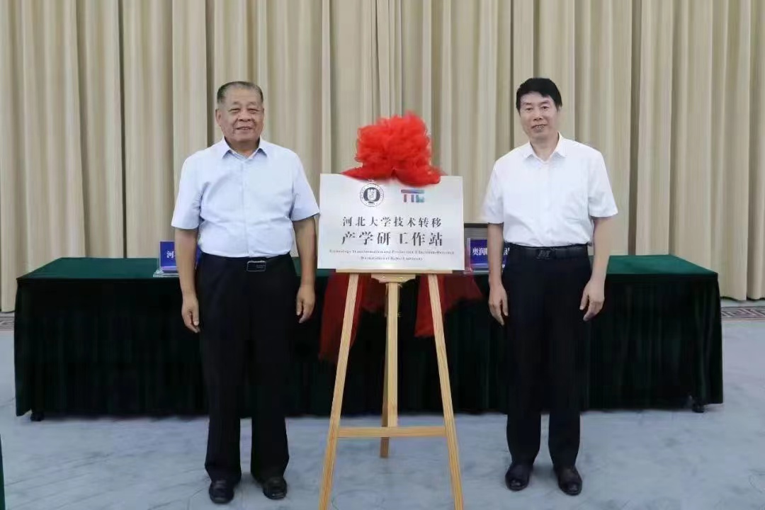 申世刚(右)和倪守强分别代表双方为“河北大学技术转移产学研工作站”揭牌