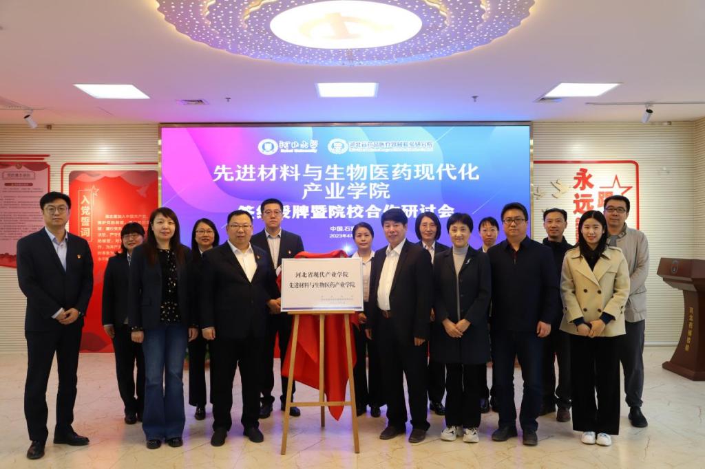 申世刚与省药品医疗器械检验研究院党委书记李挥代表双方单位共同签署了“河北省先进材料和生物医药产业学院共建协议”,并为“河北省先进材料和生物医药产业学院”揭牌。申世刚为我校生物与医药专业首批校外硕士指导教师、产业学院首批产业导师颁发聘书。