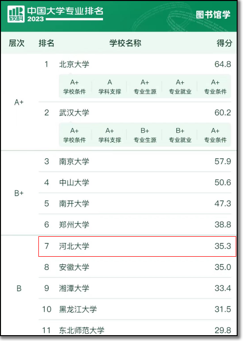 软科中国大学专业排名是迄今为止覆盖专业数量最多、参评专业规模最大的中国大学本科专业排名,覆盖了共计787个专业,全面涵盖了93个专业类和12个专业门类。本次排名结果充分展示了河北大学图书馆学专业的办学实力和高水平教学质量。