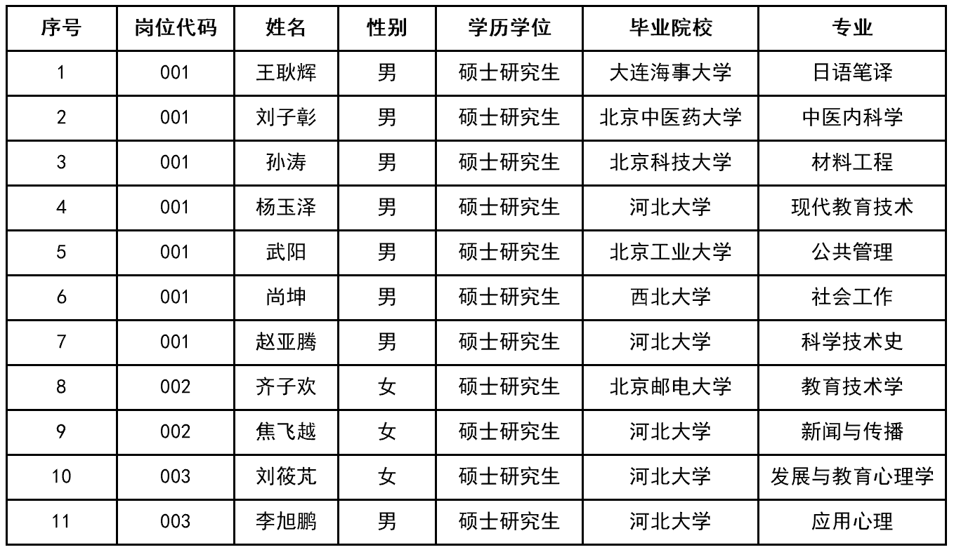 根据《河北省事业单位公开招聘工作人员暂行办法》和《河北大学2022年公开招聘专职辅导员公告》,经网上报名、资格初审、线上笔试、资格复审、综合能力考核、基本素质考核、心理测试、体检、考察等程序,确定以下11人为我校专职辅导员拟聘人员,现予以公示: