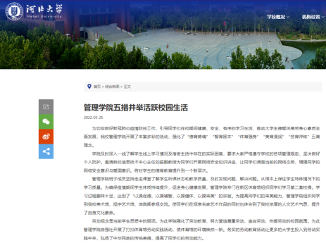 此外,为切实做好新冠肺炎疫情防控工作,引导同学们在校期间健康、有序学习和生活,学院开展了丰富多彩的活动,涉及德、智、体、美、劳各个方面,推动学生身心素质全面发展,学校也对学院相关做法以“管理学院五措并举活跃校园生活”为题做了报道。