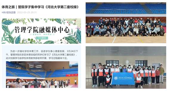 老师们在闭环管理期间依然坚持集体备课,相互交流,彼此鼓励,共同面对困难,结合疫情防控形势探讨如何上好体育课程。除保质保量完成专项课程授课任务,还为全校一、二年级学生普及新校操。通过课上老师的示范和专项老师录制视频等多渠道,在全校学生中掀起了学习新校操的热潮。结合“教会、勤练、常赛”的要求,组织班级、年级和全校学生的新校操比赛,打造具有河大特色的校园体育文化。通过“赛”不仅能够满足学生乐于竞争的需求,而且能够大大提升学生对运动的兴趣。学生们有因比赛获胜而获得的成就感,也有因比赛失败而产生努力拼搏、积极进取的奋斗精神。通过组织系统学习、小组练习和团队比赛,促进团队成员之间的互相信任、相互鼓励、共同担当的归属感。
