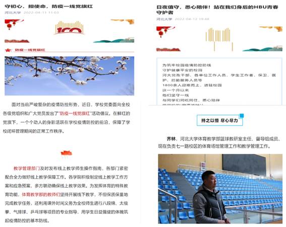 体育教学部领导的果断决定,全体教师的义无反顾、勇于担当得到了学校的认可和表扬,河北大学公众号分别以《守初心,担使命,防疫一线党旗红》(2022-04-11)和《日夜值守,悉心陪伴!站在我们身后的HBU青春守护者》(2022-04-12)为题对体育教学部坚持线下体育课和优秀教师代表—齐林进行了宣传报道。