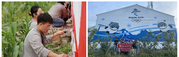 1.助力冬奥,“艺”彩飞扬。为做好2022北京冬奥会在张家口赛区的宣传推广,展现新时代、新乡村、新奥运的独特中国面貌,在实践中检验专业品质,学院精心策划、重点打造了“京张奥运文化艺术廊道绘制”专项社会实践活动,最终圆满完成近1.6万平米的绘制任务。艺术学院110名学生积极响应号召,假期中从各地返校,他们心怀冬奥,驻扎在比较艰苦的环境中,蚊虫叮咬、风吹日晒、旱厕旁作画,吃饭的时候引来全村的苍蝇围观、猫抓狗咬、三轮翻车……为赶进度工作至深夜,整个过程充满着困难与挑战。虽山路坎坷崎岖,但我们的脚步从未停止,烈日将衣背湿透,汗水为乡村谱写新篇,绘制最鲜亮的底色。同学们在社会实践的“第二课堂”中更好地锤炼了专业品质,在技能劳动中接受国情教育,体会实干创造美好生活的人生哲理。