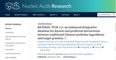 2023年10月,河北大学生命科学学院2020级生命科学凤凰班本科生程美琪,以共同第一作者身份在《Nucleic Acids Research》(最新影响因子为14.9)发表论文“BATMAN-TCM 2.0: an enhanced integrative database for known and predicted linkages between traditional Chinese medicine ingredients and target proteins”,成为继2018级孔祥任、2019级瞿英杰之后,第三位在国际期刊发表高水平论文的生命科学凤凰班本科生,凤凰班本科生梅志君、李向东、刘鹏为该论文的共同作者。该项工作由河北大学生命科学学院同国家蛋白质科学中心(北京)联合开展,生命科学学院是第三署名单位。这是生命科学学院与国家蛋白质科学中心科教结合、协同育人的又一重要成果。