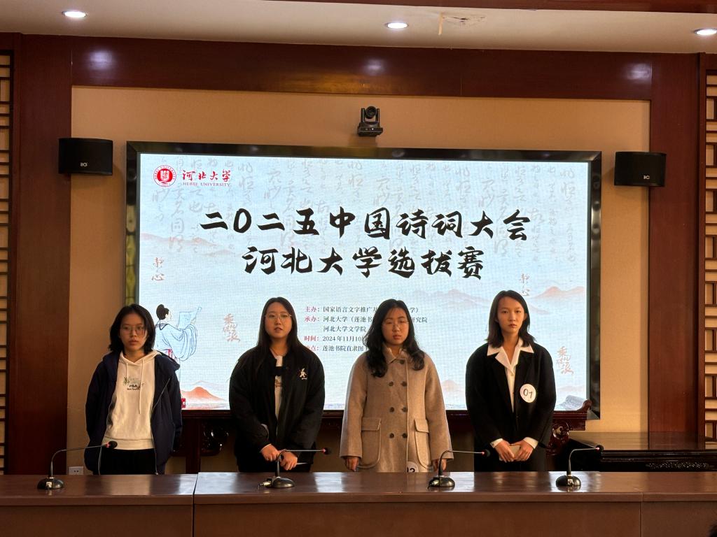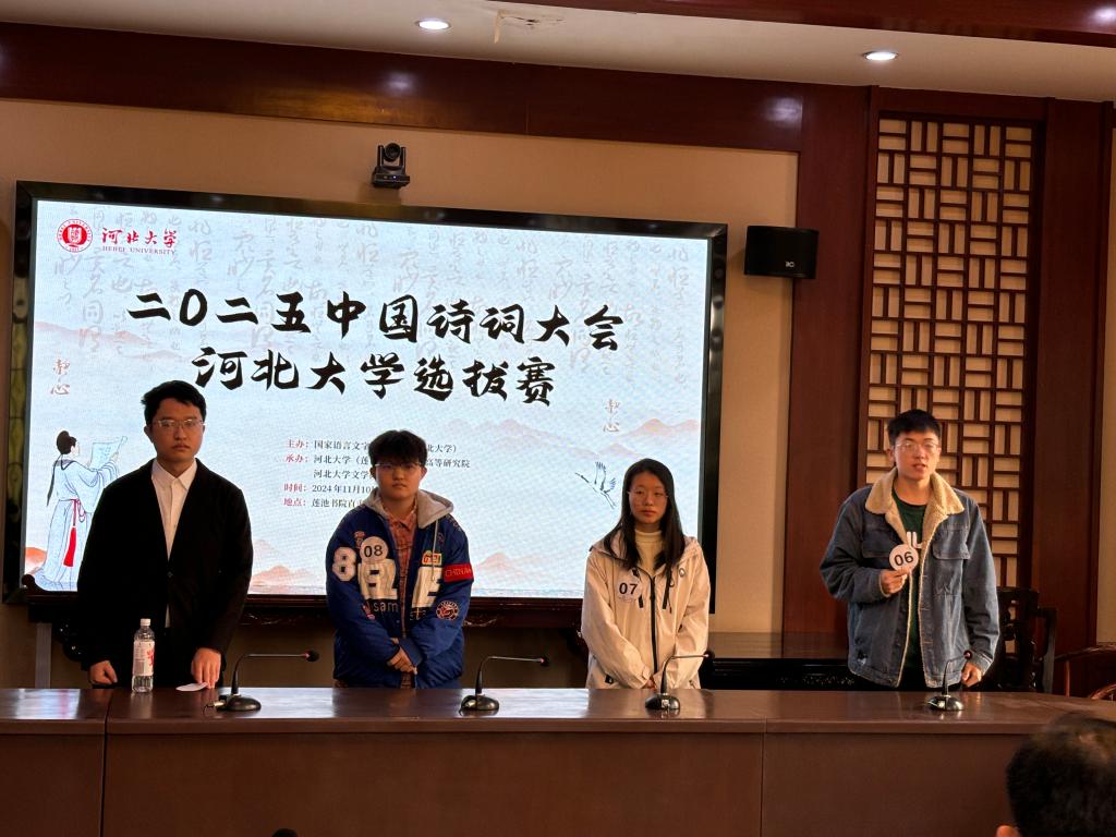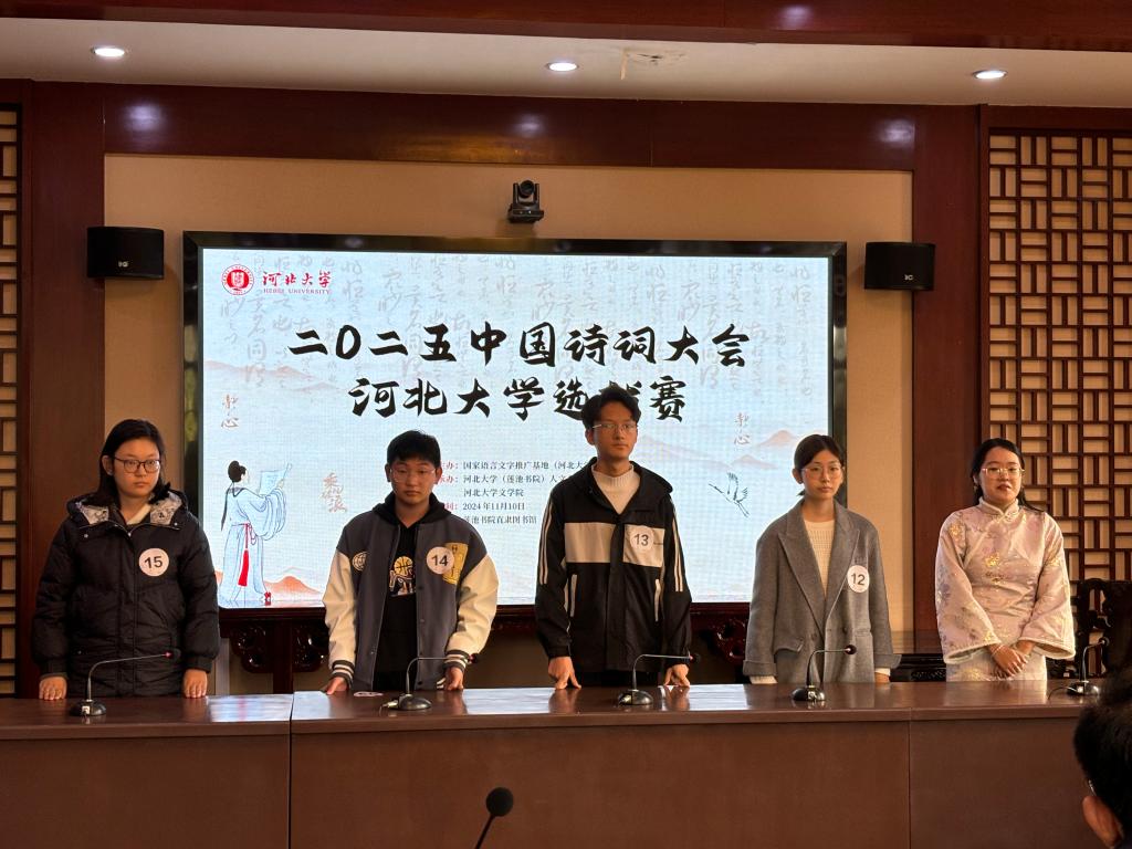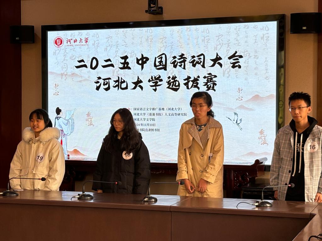 为贯彻落实习近平总书记关于弘扬中华优秀传统文化的重要指示精神,培养广大青少年学习中华经典诗词的热情,提高语言文字应用能力,提升文化素养,促进文化自信,由国家语言文字推广基地(河北大学)主办,(莲池书院)人文高等研究院、文学院承办的“2025中国诗词大会”河北大学校内选拔赛于11月10日成功举办。