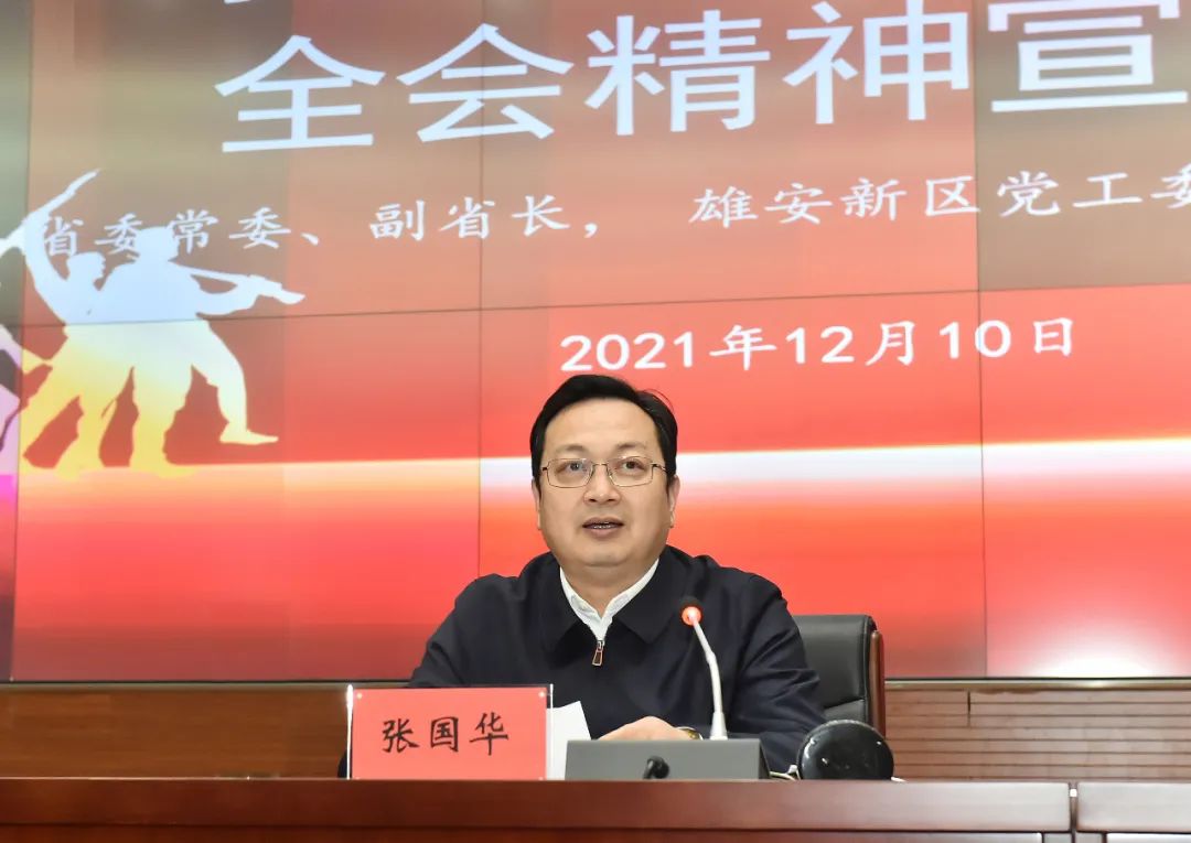 12月10日,按照省委统一部署,省委宣讲团成员、省委常委、副省长,雄安新区党工委书记、管委会主任张国华到河北大学宣讲党的十九届六中全会精神。他勉励河北大学师生深入学习宣传贯彻党的十九届六中全会精神,坚持以习近平新时代中国特色社会主义思想为指导,增强“四个意识”,坚定“四个自信”,做到“两个维护”,牢记“国之大者”,从党的百年奋斗中汲取智慧和力量,以实现中华民族伟大复兴为己任,增强做中国人的志气、骨气、底气,不负时代,不负韶华,不负党和人民的殷切期望,为第二个百年奋斗目标奉献最美的青春。