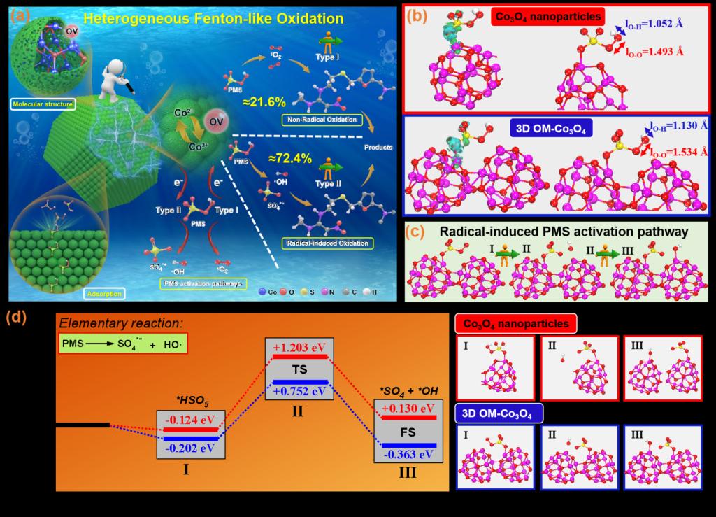 近年来,药品和个人护理用品(PPCPs)已对人类和野生动物的健康构成严重威胁,并在水体中被检测到许多种PPCPs。非均相类-Fenton氧化技术由于具有操作简单、效率高和不造成二次污染等优点成为了治理这类新型污染物的重要方法。本文中通过密度泛函(DFT)理论计算证实,有序排列的四氧化三钴纳米颗粒对目标污染物分子具有更强的吸附能和更低的活化能垒。电子顺磁共振(EPR)技术也揭示这种结构调控手段可以实现体系中单线态氧的生成,更重要的是激发多重氧化作用机制共存于二甲胺类PPCPs的降解过程。
