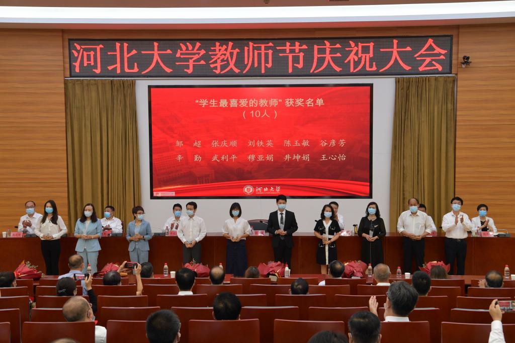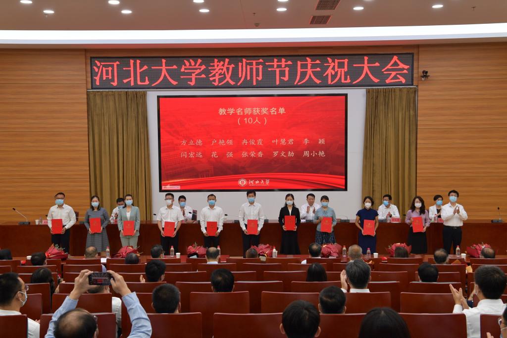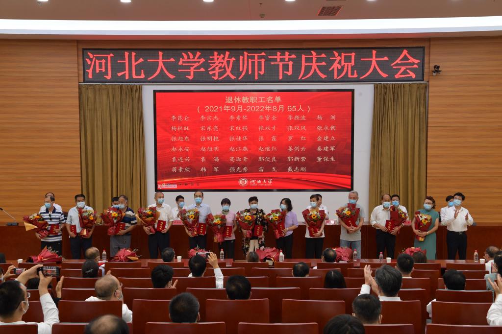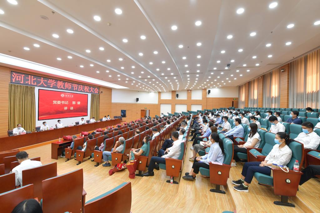 郭健在讲话中向退休教师致以诚挚敬意、向获奖教师表示热烈祝贺、向新入职教师表达美好祝福,向全校广大教师致以节日的问候。郭健表示,教师是立教之本、兴教之源,是教育发展的第一资源,是推动学校高质量发展的根本条件。河北大学在人才培养、科学研究、社会服务、文化传承与创新和疫情防控等各项工作中取得的成绩,凝聚着全校每一名教师的智慧和汗水。郭健强调,全校上下要深入学习贯彻习近平总书记关于教育的重要论述,坚持把教师队伍建设作为基础工作,进一步唱响人才强校之旋律、弘扬尊师重教之风气,始终致力于打造高端人才集聚新高地、始终致力于改善办学环境呈现新面貌、始终致力于推动教师福祉达到新高度,让广大教师在河北大学工作顺心、生活开心,安心从教、舒心从教。郭健希望,全校广大教师都要做一名信仰坚定的好教师,心中装着党、国家和人民,把握好“为谁培养人、培养什么人、怎样培养人”这一根本问题,不忘立德树人初心,牢记为党育人、为国育才使命,把培养德智体美劳全面发展的社会主义建设者和接班人作为根本任务;做一名为人师表的好教师,心中装着师德,坚持以德立身、以德立学、以德施教,努力成为“大先生”,做学生为学、为人、为事的示范,做“经师”和“人师”的统一者;做一名博学笃行的好教师,心中装着学生,铸就扎实的知识功底、过硬的教学能力、勤勉的教学态度、科学的教学方法,全心全意服务学生成长成才;做一个名爱岗敬业的好教师,心中装着学校,坚定一流大学奋斗目标,立足本职岗位,勇于担当作为,心往一处想、劲往一处使,在新的百年起点上,奋力开创河北大学办学事业新局面,以实际行动和优异成绩迎接党的二十大胜利召开!