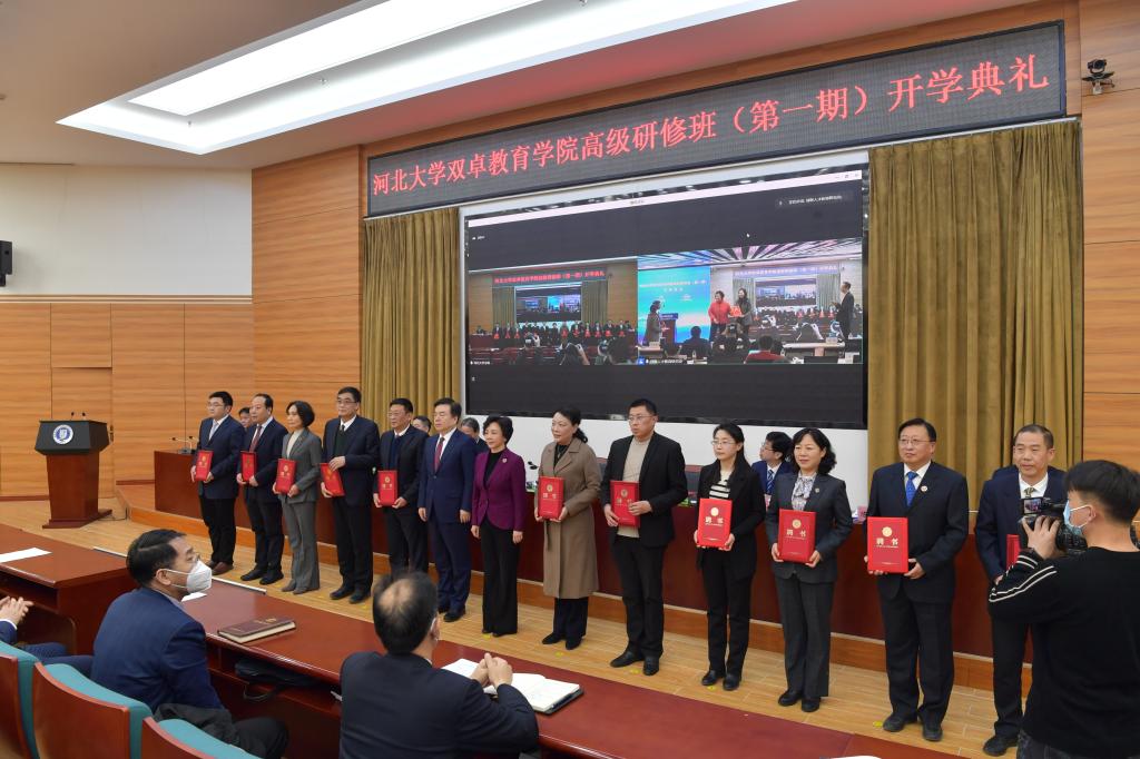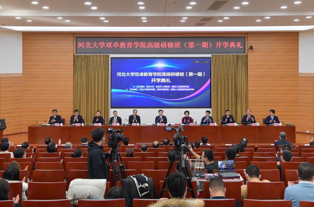 1月29日,河北大学与保定市政府、创新人才教育研究会以线上线下相结合方式于北京、保定举办河北大学双卓教育学院高级研修班(第一期)开学典礼。教育部教师工作司司长任友群,河北省教育厅一级巡视员王利迁,保定市委书记党晓龙,创新人才教育研究会会长刘彭芝,雄安新区党工委副书记、管委会副主任万岷致辞。保定市委副书记、市长闫继红、副市长杨伟坤,学校党委书记郭健、党委常委、副校长陈红军、孟庆瑜,省教育厅基础教育处处长郭立森、创新人才教育研究会执行会长李春林、保定市教育局局长胡占房等出席。学校有关职能部门负责人、教育学院班子成员、研修班班主任及学员代表现场参会。会议分两个阶段进行,分别由郭健、孟庆瑜主持。