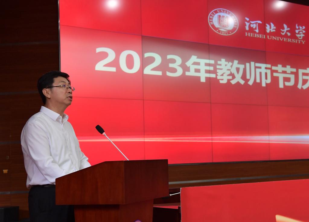 党委书记郭健在讲话中代表学校党委,向退休教师致以崇高敬意,向获奖教师表示热烈祝贺,向新入职教师表达美好祝福,向全校广大教师致以节日的问候。他向与会师生介绍了学校过去一年在人才培养、学科建设、科学研究、社会服务等工作中取得的成绩,表示学校办学事业的高质量发展,凝聚着每一位教师的智慧力量、心血汗水。他强调,要把加强教师队伍建设作为最重要的基础工作来抓,扎实推进“人才强校”战略,实施一流师资建设工程,坚持“以师生为本”工作理念,用心用情致力于让广大教师在河北大学工作顺心、生活开心,安心从教、热心从教。他希望,全校广大教师要心怀“国之大者”,自觉做习近平新时代中国特色社会主义思想的坚定信仰者和忠实实践者,坚持为党育人、为国育才,培养更多德智体美劳全面发展的社会主义建设者和接班人;要涵养道德学识,努力做“经师”“人师”相统一的大先生,用大爱书写教育人生;要融入学校发展,积极做一流大学的建设者,发扬“主人翁”精神,心系“强校之梦”、肩扛“强校之责”,在部省合建平台上推动学校“双一流”建设不断取得新成效。