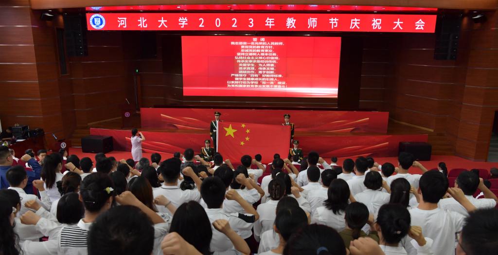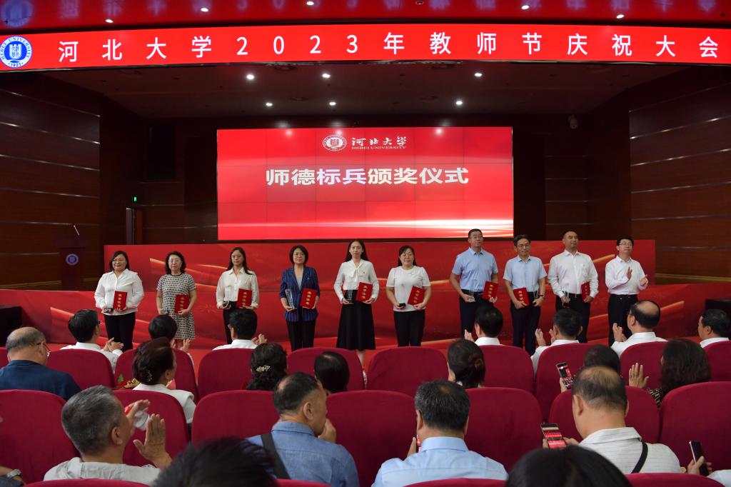 躬耕教坛,强国有我。9月10日下午,河北大学在七一路校区图书馆报告厅隆重举行2023年教师节庆祝大会,向全校教师送上衷心祝福。学校领导郭健、杨立海、申世刚、陈红军、徐建民、倪志宇、孟庆瑜、胡力军、过常宝出席大会。退休教职工代表、年度师德标兵、新入职教师代表、中层单位的主要负责同志及学生代表参加会议。会议由党委副书记杨立海主持。