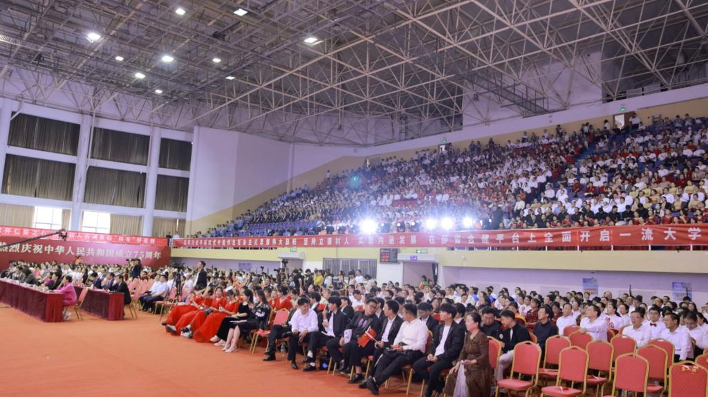 礼赞新中国,奋进新时代。9月26日,我校在五四路校区多功能馆隆重举办庆祝中华人民共和国成立75周年教职工合唱比赛。全校各单位教职工代表欢聚一堂,讴歌新中国成立75年波澜壮阔的光辉历程,唱响河大师生爱党爱国的炽热情怀,抒发为强国建设、民族复兴贡献河大力量,向着一流高水平大学阔步前行的壮志豪情。校领导郭健、申世刚、陈红军、单耀军、胡力军、梁巍、张扬建出席活动。