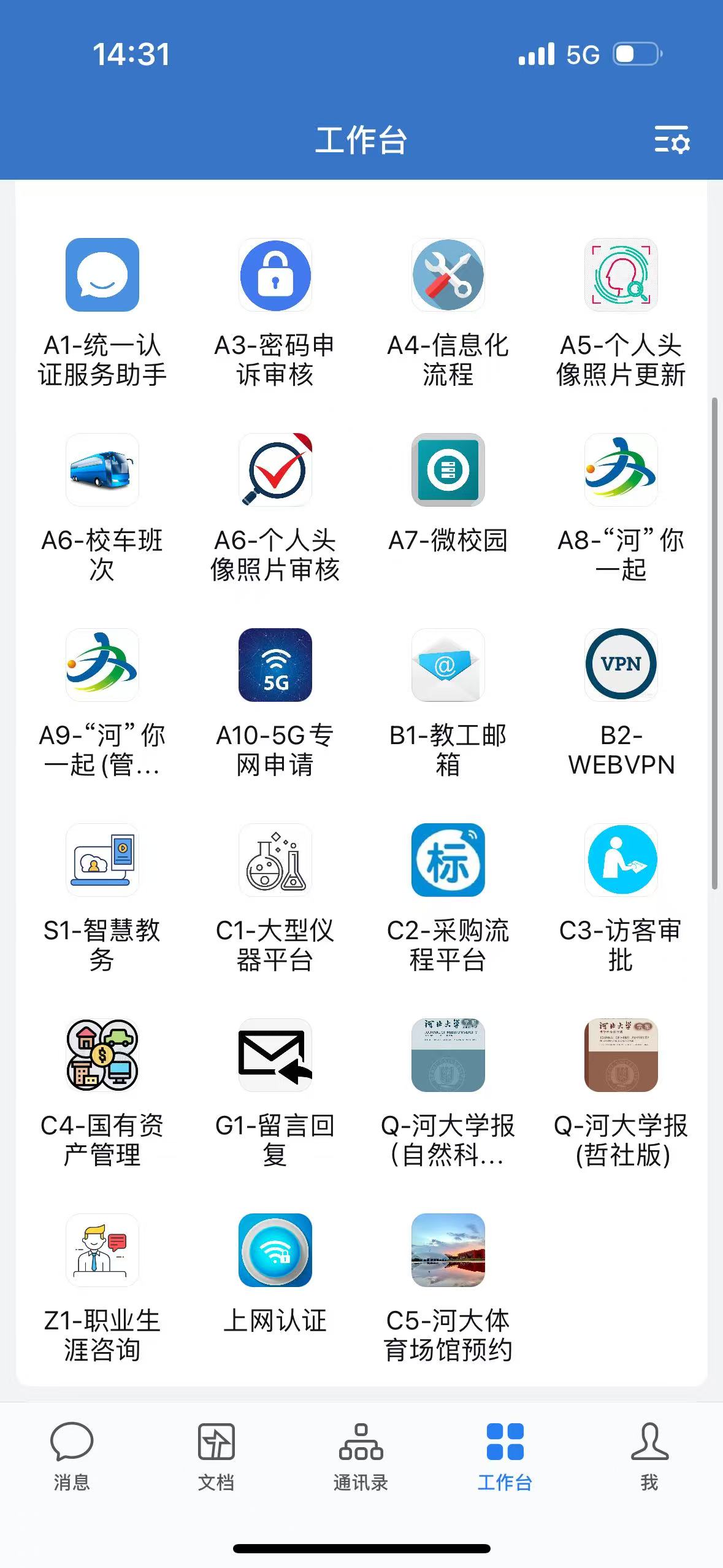 3. 或在企业微信(APP或PC版客户端)中工作台打开学校的企业微信应用,如统一认证服务助手、信息化流程、WEBVPN等;以河北大学企业微信用户的身份,使用企业微信的高级功能,如视频会议、群直播、群聊等。