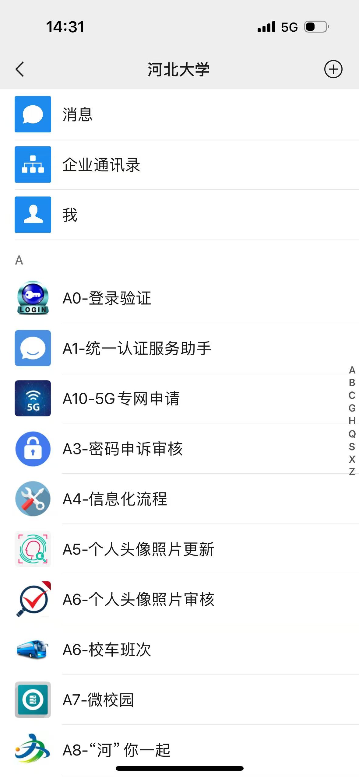 2. 成功加入企业微信的用户在微信中可使用小程序功能,访问相应授权的小程序(通讯录-我的企业中可找到“河北大学”);