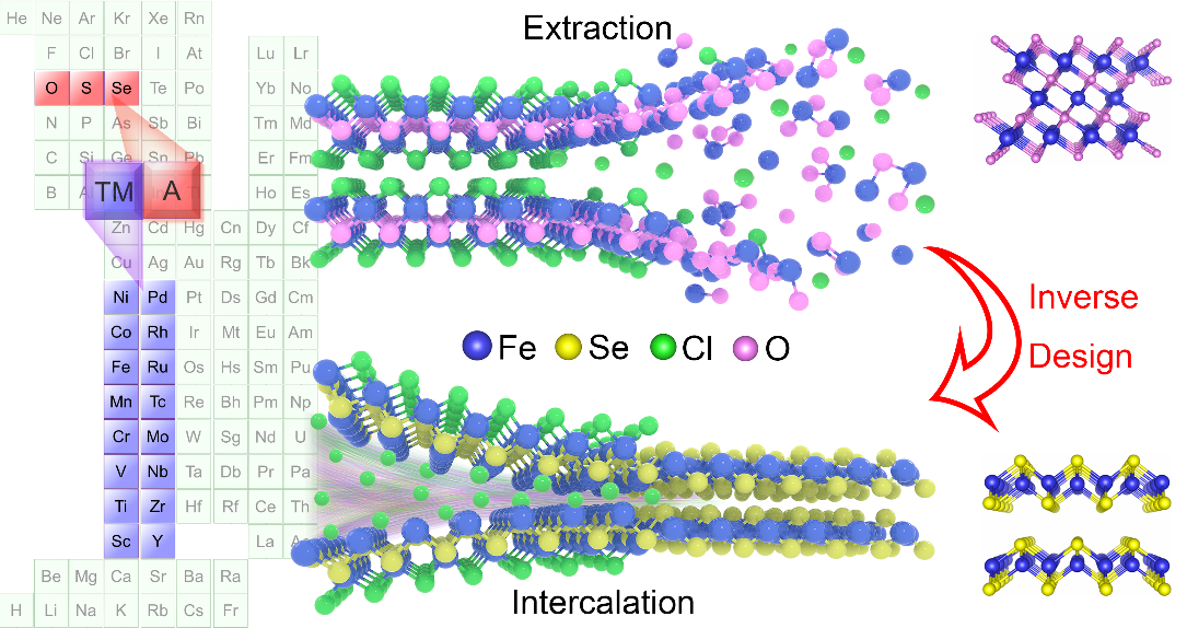 氯离子电池(CIB)具有优秀的储能特性。近年来,过渡金属氯氧化合物(TMOCl)由于其层状结构和在有机电解质中的高稳定性,成为CIB正极中最具吸引力的材料之一。但在放电过程中,低Cl含量下的TMOCl会发生转化反应,从而对CIB的循环性能和能量密度产生不利影响。为了消除转化反应,作者提出了通过高通量筛选结合逆向设计的方法在过渡金属氧族化合物中探索新型CIB正极材料。基于动态稳定性、热力学稳定性和Cl-结合能力等综合评估,最终筛选出的FeSe具有拓扑稳定的Fe-Se框架,能够完全避免低氯离子浓度下正极的分解和重构行为。计算结果显示在循环过程中,连续的Cl-插层反应保证了接近3.2 V的平稳电压平台。由于FeSeCl的3d-4p轨道杂化的增强,FeSe的金属性质在FeSeCl相中得以保持。从动力学性质上看,FeSe和FeSeCl中Cl-迁移能垒较小,分别为0.13 eV和0.28 eV。该工作为阴离子电池体系的电极材料开发设计提供了重要理论探索方案。