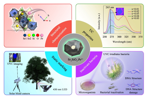 研究表明UVC光子可以破坏微生物中DNA/RNA,考虑到当下新冠疫情全球流行的大背景,UVC光子在消杀领域具有十分广阔的应用前景。尽管深紫外发光二极管被视作最有前景的UVC光源,但是目前因面临一些技术上的难题以及某些应用场景的限制而阻碍了其大规模应用。本工作中,作者研究了通过上转换方式产生UVC光子的新方法,即将镨离子掺入到硅酸锶基质中成功制备出一种上转换发光新材料,该材料可以被450nm激光或LED有效激发而发产生UVC光子发射。同时进一步研究了UVC发射的泵浦功率依赖关系和温度依赖曲线,结果表明该UVC发射源于两光子的上转换过程,且具有较好的热稳定性。此种产生UVC光子的方法除了可应用在常规的静态标记应用,还在动态跟踪无人机方面具备潜在应用价值。此外,此种上转换产生UVC光子的方式可以解决UVC光子无法穿透普通玻璃的弊端进而实现对封闭玻璃器皿内部空间进行紫外消杀,从而证实了上转换UVC光子方法的独特性,使得上转换UVC策略有望成为深紫外发光二极管的有益补充。