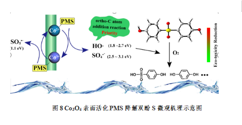 上述研究成果连续3期发表在环境功能材料领域环境工程领域期刊Chemical Engineering Journal(中科院一区TOP,IF=16.744)。此外,青年教师王泽华博士与山东大学孙孝敏教授团队合作,采用密度泛函理论研究了尖晶石Co3O4催化剂非均相活化PMS产生活性氧化剂(HO、SO4•-1O2),对BPS降解的微观机理,并对降解过程中生态毒性的演变进行了预测。研究采用密度泛函理论(DFT)方法为Co3O4/PMS体系中双酚S的降解机理提供了新的见解。该科研成果发表在环境科学领域期刊Journal of Cleaner Production(中科院一区TOP,IF=9.297)。