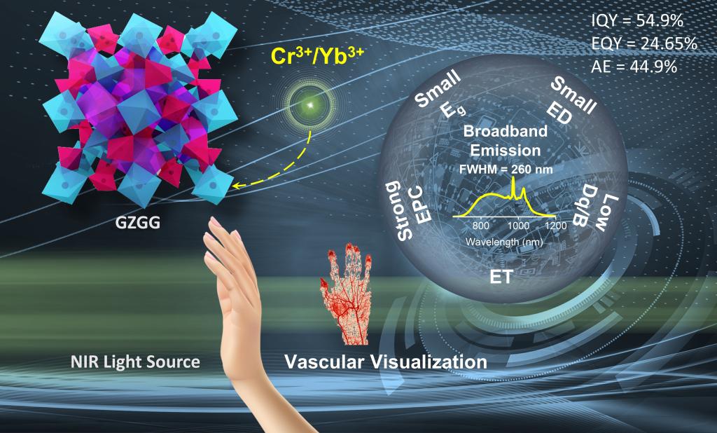 (2)面向我国高端照明材料产业发展战略需求,开发了系列具有优异发光特性的近红外发光材料。以GaTaO4为载体、通过Cr/Yb掺杂实现了带宽达300 nm的近红外发光,有效提升了近红外发射的内量子效率(95.5%)与温度稳定性(90%@423 K),相关工作以通讯作者发表在《Advanced Optical Materials》(2022, 10(18), 2201076)。以Gd3Zn2GaGe2O12为载体、通过调控Cr/Yb能量转移实现了54.9%和24.65%的近红外发射内外量子产率,发射带宽可达260 nm,封装的pc-LED可用于血管可视化和夜视,相关工作以通讯作者发表在《Optics Express》(2022 30(16),28550-28558)和《Chemical Engineering Journal》(2022 437,135346)。