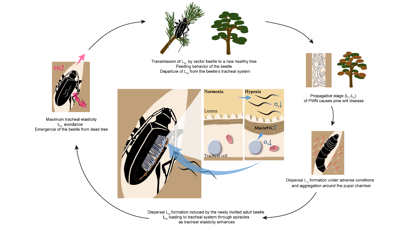松材线虫(PWN,Bursaphelenchusxylophilus)是引起松树枯萎病的主要致病因子,原产自北美,后入侵至亚洲和欧洲,给入侵地森林生态系统造成毁灭性破坏。松材线虫的自然传播必须依赖媒介昆虫的携带,媒介天牛对线虫的承载量决定了其传播效率。气管是媒介天牛携带线虫的主要部位,每只媒介天牛气管中平均携带1.5万头,最高可达28万头松材线虫。但天牛的气管系统如何耐受大量的线虫仍然是一个悬而未决的问题。