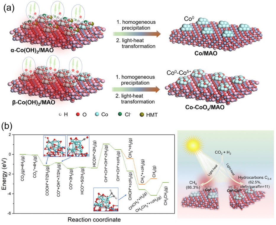 通过光热催化二氧化碳(CO2)加氢将CO2转化为多碳(C2+)产物是缓解能源短缺和实现碳中和的一种有效的方法。该反应的瓶颈在于如何调控C1中间体的C-C偶联反应。本工作通过原位光热活化构筑Co0-Coδ+活性结构,作为C1中间体的C-C耦合协同催化活性位点。实验和理论计算结果证实了界面双活性位点实现有效吸附、活化CO2,通过Co0位点生成C1中间体,而引入Coδ+的缺电子态能有效降低关键CHCH*中间体的能垒。该研究提供了一种新的思路设计应用于光还原CO2转化为C2+碳氢化合物的光热催化剂。