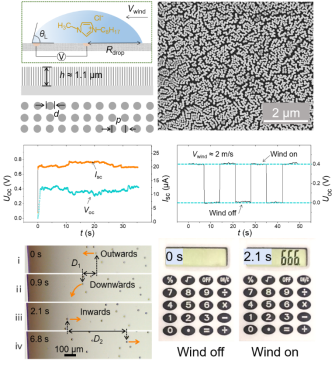 传统风力发电技术往往需要风速大于5m/s来旋转叶片,占据世界较大面积的低风速地域不能有效利用风力发电技术。本研究发现当离子液体液滴位于具有毛细管稳定三相接触线的超疏水纳米线阵列上时,可以灵敏地将风吹引起的空气/液体界面摩擦转化为内部旋转,形成分层循环流动。这种纳米密闭空间内的离子液体流动会自发地诱导正离子和负离子的重新分配,并持续产生电能,基于此液滴的风电场可以在低风速下产生60 V的电压,这是一种与以往液滴发电不同的工作机制。