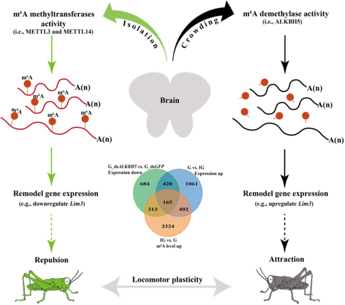 接着对甲基化酶METTL3、METTL14和去甲基化酶ALKBH5进行RNAi并结合行为学测试,发现m6A RNA修饰可以有效可逆地调节飞蝗的运动行为和个体间吸引行为,证明该RNA修饰是精准调控聚集行为的重要机制(图1)。