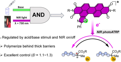 近红外光诱导聚合具有条件温和、高穿透性的特点,在大规模制备聚合物和生物领域具有独特优势,但近红外光低的光子能量也限制了光催化剂的激发态活性,开发有效的近红外光催化剂仍具有挑战性。团队基于前期研究基础(Macromolecules, 2021, 54, 10, 4633–4640,Macromolecules, 2023, 56, 11, 4181–4189),提出了一种新的近红外光催化剂。咪唑并苝酰亚胺分子中的咪唑基团在弱碱性环境中可以脱去质子,从而形成了具有近红外光吸收和强的激发态还原能力的咪唑阴离子并苝酰亚胺。基于这类光催化剂实现了近红外光诱导原子转移自由基聚合,且具有以下特点:(1)具备活性聚合特征,所得聚合物分子量窄;(2)近红外光穿透皮肤组织等障碍物后仍能聚合;(3)通过弱酸弱碱刺激和近红外光开关两种方式控制聚合的“开关”。
