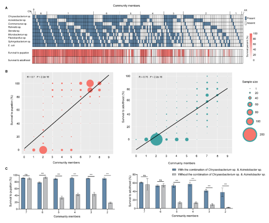 本研究基于Micheal R. Strand教授课题组前期构建的蚊虫无菌品系构建系统(Molecular Ecology, 2016; PNAS, 2017),通过人为构建不同生境和肠道微生物群落,发现随着菌群多样性的下降,其保护作用逐渐减弱;但关键菌株(Acinetobacter sp.和Chryseobacterium sp.)的存在能够缓解菌群多样性下降造成导致的保护性减弱。