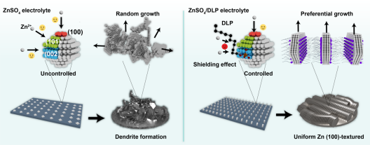 水系锌离子电池(AZIBs)由于具有低成本、操作安全、环境友好和高容量等优点,被认为是未来新型储能系统的有力竞争者。然而,锌负极枝晶的生长是制约锌离子电池发展的关键难题。传统报道的抑制锌枝晶的方式是通过控制(002)晶面的沉积来获得平整的锌表面,然而(002)晶面的锌沉积动力学缓慢。前期研究表明(100)晶面的锌沉积动力学比(002)晶面甚至(101)晶面更快,如能实现(100)晶面的锌均匀沉积,将使得锌原子能够实现超快速的沉积/剥离。但是同时,快速的(100)晶面锌沉积很难得到控制,从而造成枝晶生长猖獗,因此,实现(100)晶面的锌均匀沉积充满挑战性。该工作通过引入磷酸单十二烷基酯钠盐(DLP)作为电解液添加剂,利用DLP中的磷酸基团的强极性选择性吸附于(002)晶面,而暴露的长链碳氢基团能够有效屏蔽(002)晶面的生长,从而促进了锌在(100)晶面的择优生长,最终在锌负极表面形成了垂直且致密的锌沉积层,抑制了锌枝晶的产生。得益于(100)晶面快速的锌沉积/剥离动力学,该工作实现了超高的锌沉积/剥离电流密度和高沉积容量,锌负极在50 mA cm-2的超高电流密度下也能稳定循环。该工作为锌负极优选晶面沉积提供了新思路,为实现超快锌沉积/剥离、且无枝晶的锌负极提供了示范。