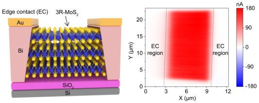 体光伏效应(BPVE)通常存在于非中心对称结构材料中,因其可能超过传统太阳能电池的肖克利-奎塞尔(SQ)极限,近年来引起研究者的广泛关注。最近,过渡金属硫化物(TMD)在BPVE方面展现出巨大的潜力,其光电流比其他材料体系大几个数量级。然而,仍存在几个关键问题亟待解决:首先,由于费米能级钉扎效应,金属与TMD之间通常形成非欧姆接触,界面肖特基势垒抑制了BPVE的性能,导致准确评估BPVE变得困难。其次,以往的器件多采用顶部接触(TC)电极,这在载流子的传输和收集方面存在一定限制。最后,目前对BPVE的研究主要集中在提高其光电流或效率上,而BPVE与传统光伏效应(PVE)之间的相互作用尚未得到深入探索。这些问题的解决将有助于更好地发挥TMD在BPVE领域的潜力,并推动相关技术的进一步发展。为此,本文通过构筑边缘接触(EC)Bi半金属电极研究了3R-MoS2中的体光伏效应。研究发现,Bi半金属能够有效消除金属-过渡金属硫化物之间的肖特基势垒,从而促进体光伏效应的实现。而EC不仅能更高效地收集材料中的光生载流子,还能诱导均匀的拉伸应力,打破3R-MoS2的面内反演对称性,使得体光伏电流相比传统表面接触方式提升了100倍以上。此外,本文进一步设计并制备了3R-MoS2/WSe2异质结,探讨了BPVE与PVE的协同工作机制,并据此提出了其在光位敏探测器上的新重要应用。