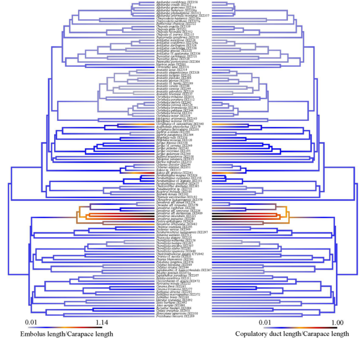 图2.斑蛛族跳蛛雄性插入器(左)和雌性交配管(右)长度的祖先状态重建