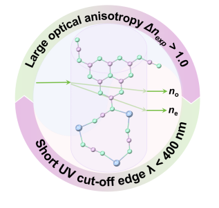 双折射材料在光通信、偏振控制以及激光技术等光学应用领域中占据着基础性的关键地位。当前商用的TiO₂、YVO₄等双折射晶体因双折射率低或透光范围有限难以满足光学器件的需求。尽管一些二维材料在可见-红外波段能够实现超高双折射,这些材料均无法覆盖紫外波段。开发兼具紫外宽透光范围(波长截止边<400 nm)与超大双折射(Δn>0.3)的材料,仍然面临着巨大挑战。本项工作提出了一种新颖的思路,通过适当排列的扩展π共轭基团平衡双折射和紫外透过率,从而构筑具有超高光学各项异性的紫外双折射晶体。研究工作报道了一种新型双折射材料-Li3(C9N13)·6H2O(LCN),LCN表现出超高的光学各项异性(Δnexp= 1.031@546 nm),在紫外区域的双折射材料中创造了记录。理论计算进一步揭示了LCN超高光学各向异性源于平面π共轭[C9N13]基团及其理想的共平面排列。该工作为新型双折射材料的设计提供了新的思路。