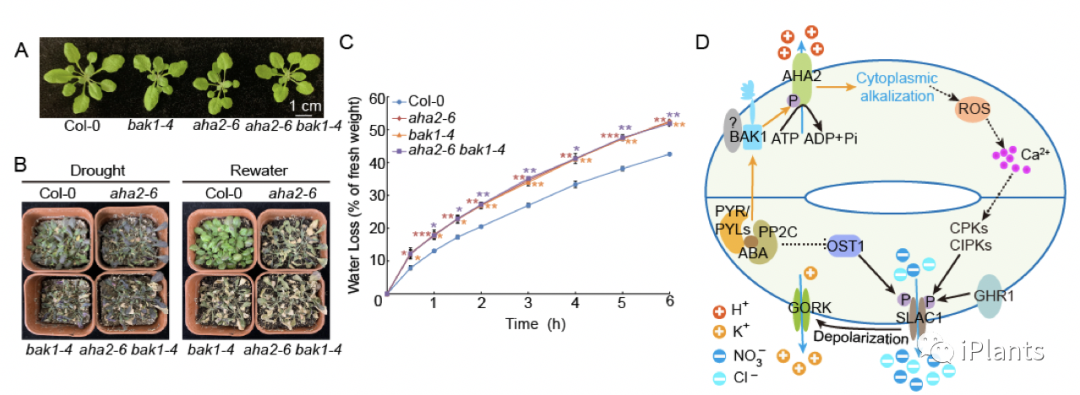 综上所述,该研究揭示了AHA2参与ABA诱导气孔关闭的早期信号转导过程、协同BAK1正调控ABA诱导气孔关闭信号通路。为深入研究植物对干旱胁迫响应提供了重要的理论基础。