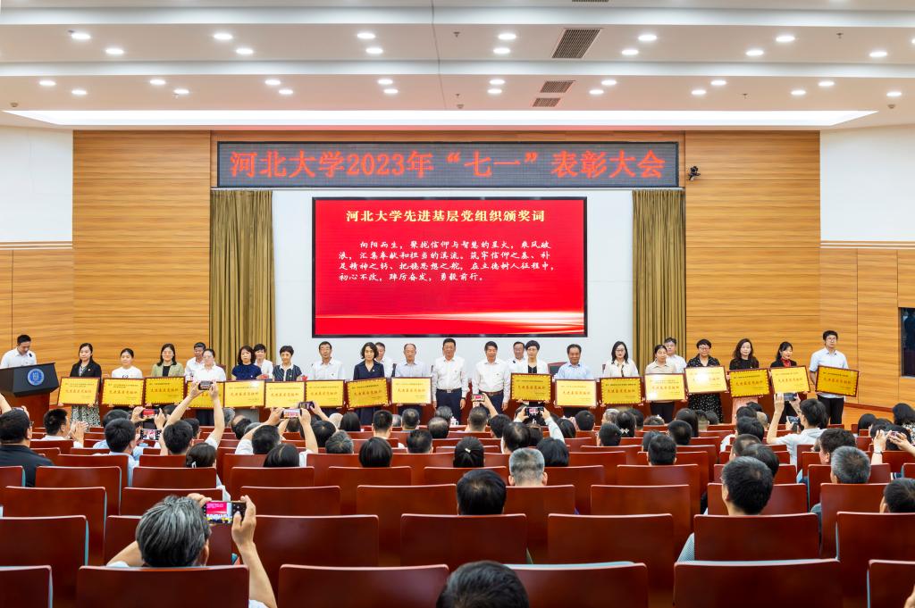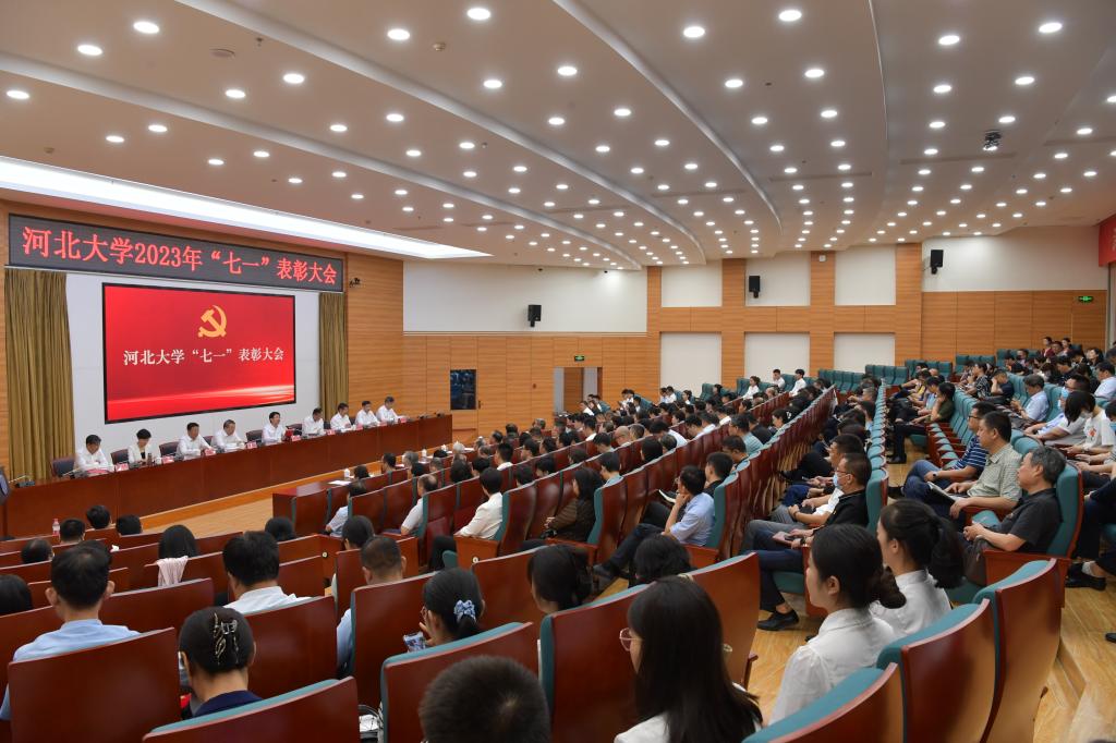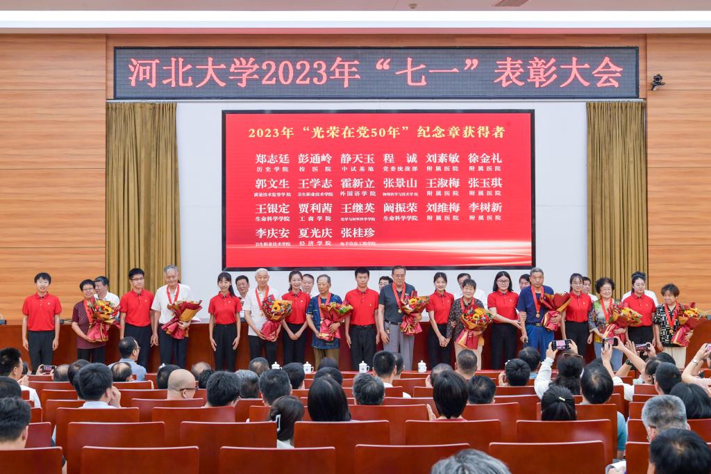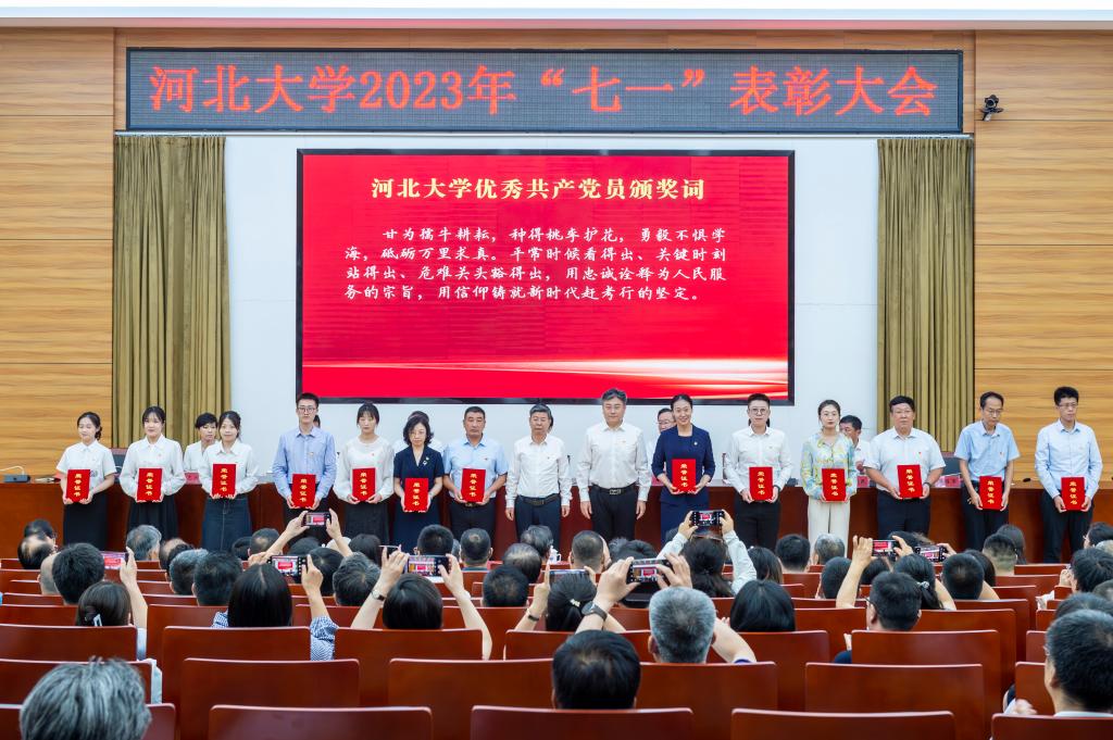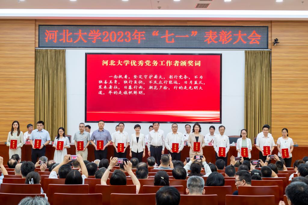 6月28日上午,河北大学在五四路校区主楼304报告厅隆重举行2023年“七一”表彰大会,热烈庆祝中国共产党成立102周年,对学校各部门、各单位两年来涌现出的“优秀共产党员”“优秀党务工作者”“先进基层党组织”进行表彰,激励和引导全校广大党员干部对标看齐、凝心聚力,为推动学校高质量发展开拓奋进、团结奋斗。学校领导郭健、康乐、杨立海、申世刚、陈红军、徐建民、倪志宇、单耀军、胡力军出席大会。党委书记郭健讲话,党委副书记、校长康乐主持大会。