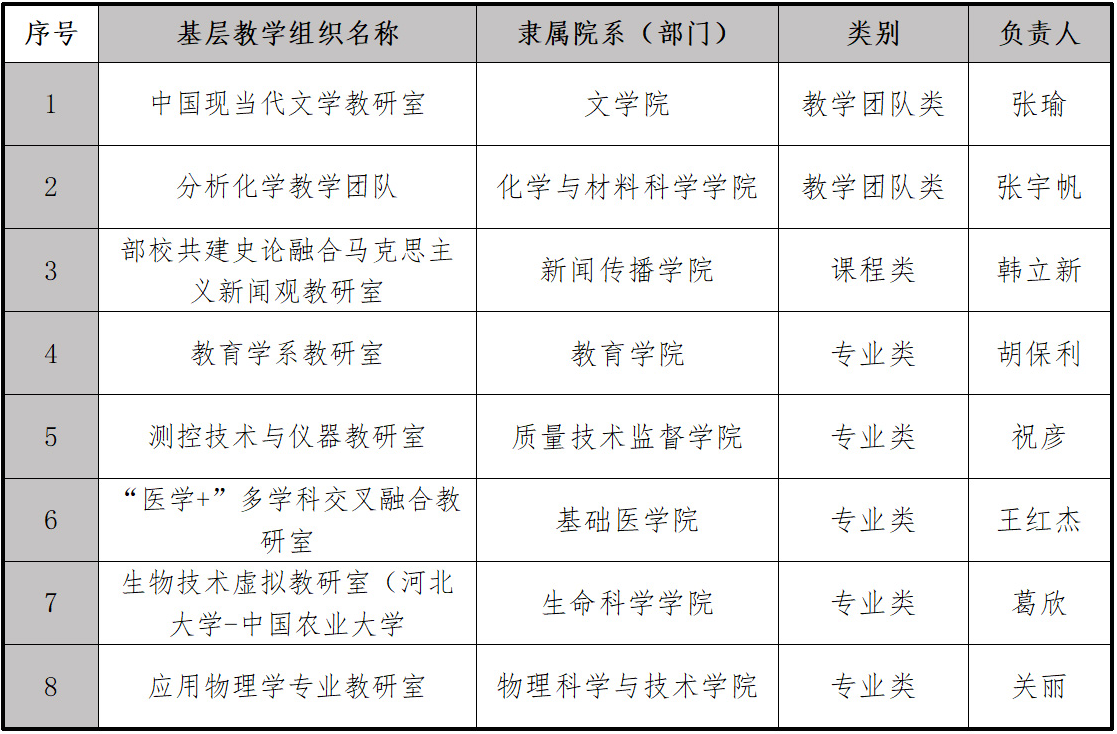 近日,河北省教育厅发布了《关于公布2023年度河北省高等学校优秀和达标基层教学组织名单的通知》(冀教高函〔2023〕80号),我校中国现当代文学教研室等8个基层教学组织荣获省级优秀基层教学组织,外国文学教研室等107个基层教学组织获批省级达标基层教学组织。