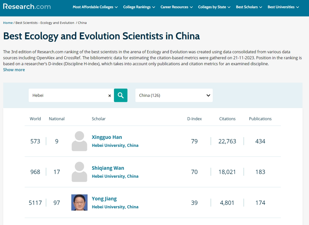 4月21日,research.com网站公布了“生态与进化”领域全球高被引学者名单。生命科学学院韩兴国教授、万师强教授和姜勇教授入选“Best Ecology and Evolution Scientists in China”榜单(全国共126名学者入选);河北大学入选“Best Ecology and Evolution Universities in the World 2024”榜单,在全国37个入选高校中位列第四。
