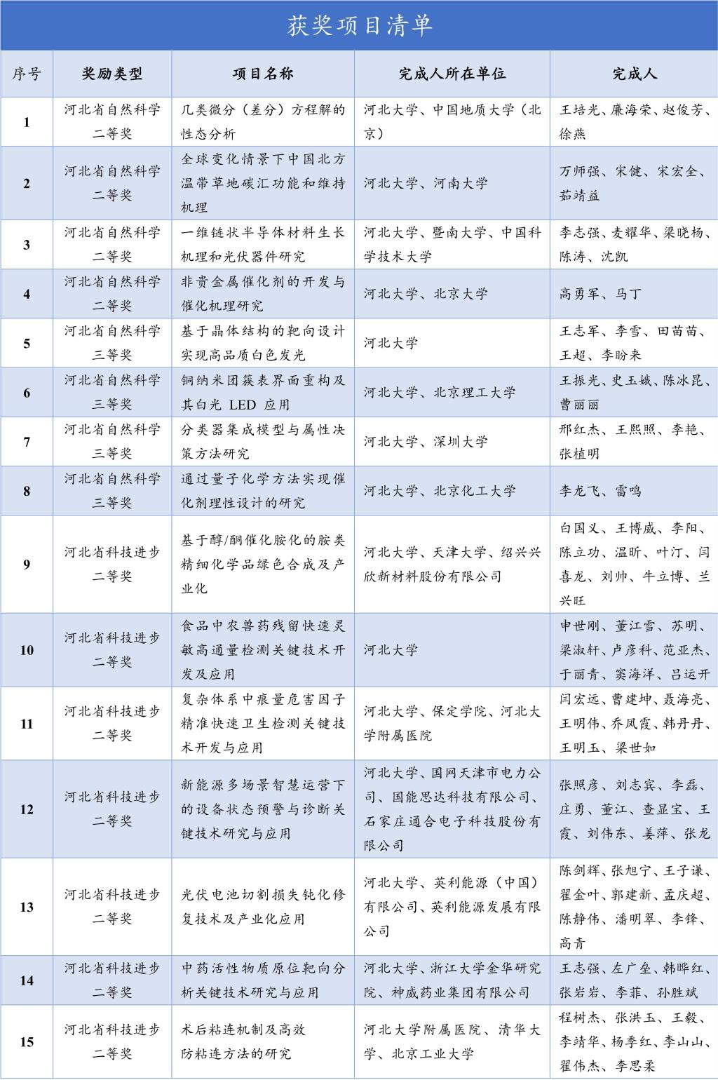 河北省科学技术奖由河北省人民政府设立,旨在表彰在河北省科学技术活动中做出突出贡献的个人和组织。经过形式审查、网络评审、行业评审和总评答辩等程序,最终共评出2023年度河北省科学技术奖253项(人/组织)。河北大学共获2023年度河北省科学技术奖15项(详见获奖清单),其中二等奖首次突破10项;自然科学奖8项,占全省自然奖总数32%。